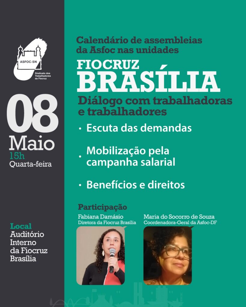 Na próxima quarta-feira (08), às 15h, a Asfoc fará mais uma assembleia, desta vez na Fiocruz Brasília. O evento será realizado no Auditório Interno do local e contará com a presença do presidente Paulo Garrido.