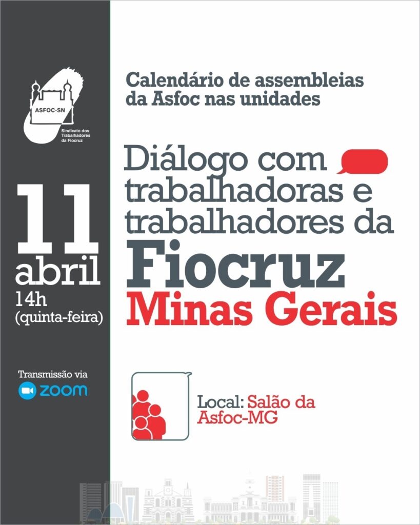 Na próxima quinta-feira (11), às 14h, a Asfoc-MG será sede de mais uma assembleia do calendário de escuta, mobilização e organização do sindicato, que dialoga com os servidores e servidoras nos estados.