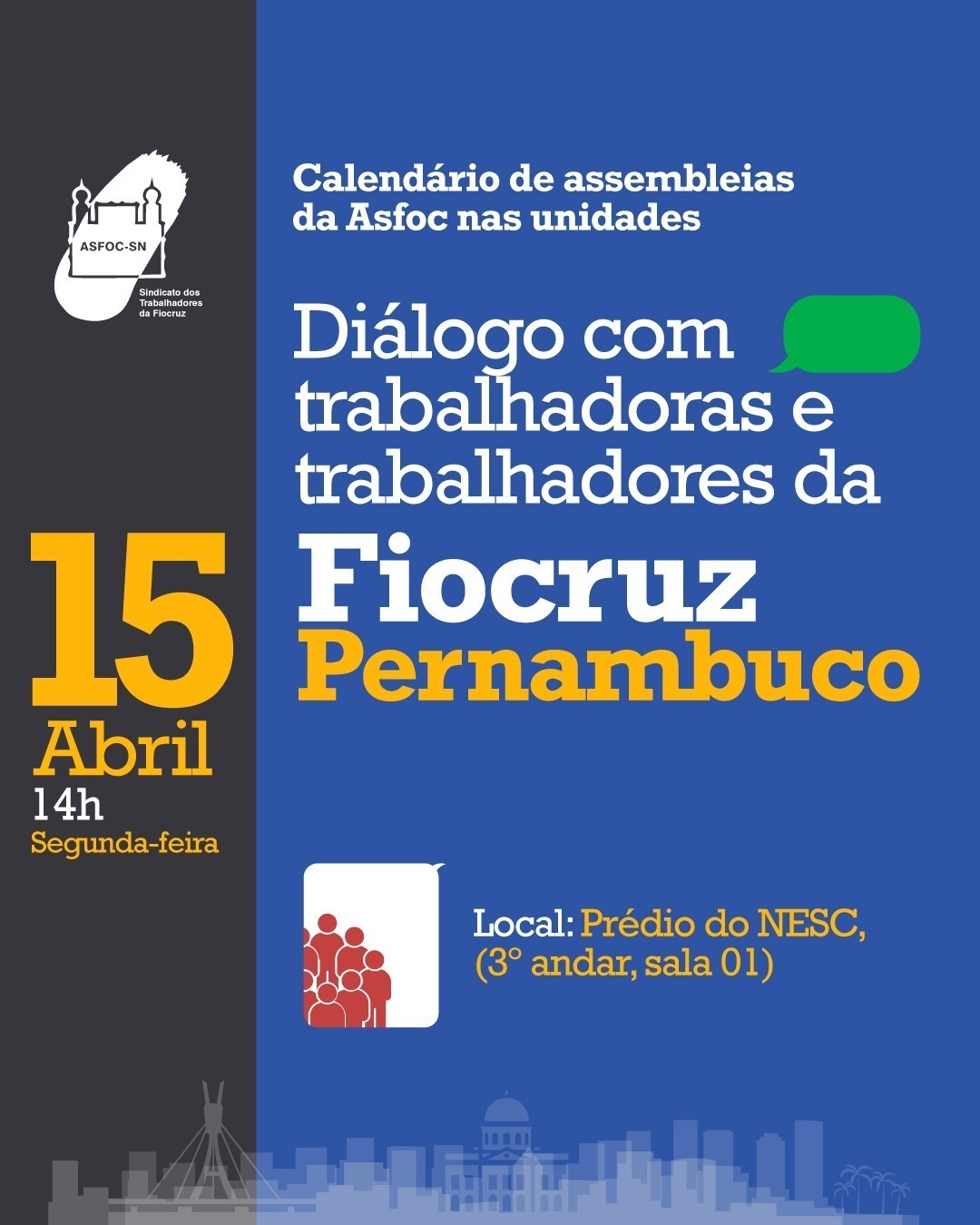 Na próxima segunda-feira (15), às 14h, a Asfoc Pernambuco receberá a quarta assembleia do sindicato, que vem percorrendo as regionais de todo o país. O encontro faz parte do calendário de lutas que dialoga com os servidores e servidoras e soma esforços para a luta por valorização e reajuste salarial. O presidente Paulo Garrido e a diretora de Administração e Finanças, Luciana Lindenmeyer, estarão presentes.