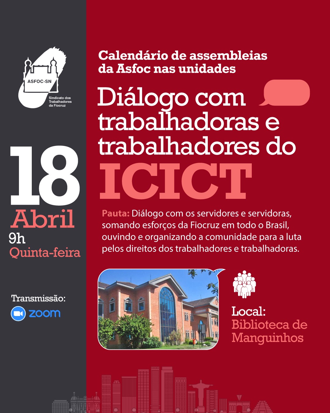 A próxima assembleia Asfoc em unidades da Fiocruz acontece no Instituto de Comunicação e Informação Científica e Tecnológica (ICICT), na Biblioteca de Manguinhos, na quinta-feira (18), às 9h. O encontro faz parte do calendário de visitas do sindicato pelas regionais espalhadas pelo Brasil.