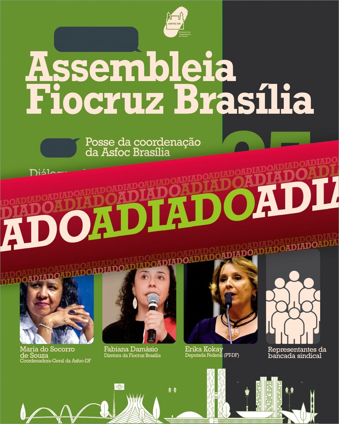 Em virtude das cerimônias de despedida da ex-diretora-geral da Asfoc, Ilma Noronha, o primeiro evento do calendário de assembleias nas unidades presenciais, que seria realizado hoje (25), na Fiocruz Brasília, foi adiado.