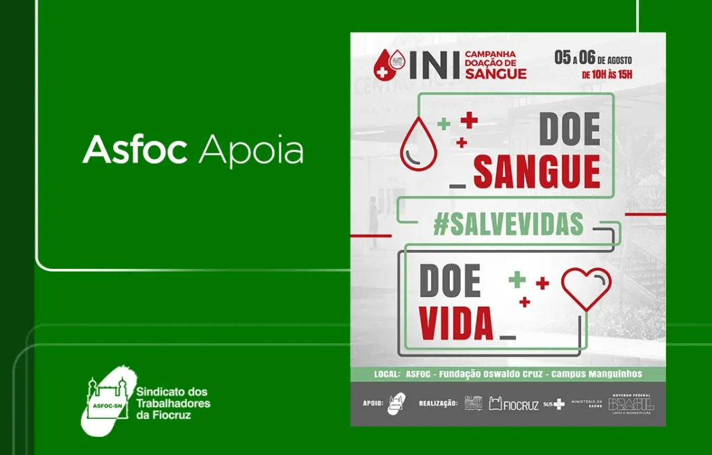 Nos dias 05 e 06 de agosto (terça e quarta-feira), a sede da Asfoc-SN, no campus Manguinhos da Fiocruz, receberá mais uma edição da campanha de doação de sangue promovida pelo Instituto Nacional de Infectologia Evandro Chagas (INI/Fiocruz), em parceria com o Hemorio e com o apoio do sindicato.