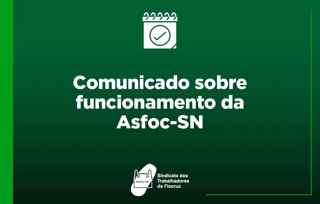 Em virtude do feriado do Dia da Trabalhadora e do Trabalhador, a Asfoc-SN informa que não haverá expediente nos dias 01 e 02 de maio.