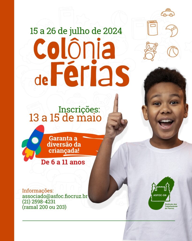 As inscrições para a Colônia de Férias da Asfoc, que será realizada entre os dias 15 e 26 de julho, já estão abertas. Você pode fazer a sua inscrição até a próxima quarta-feira (15), às 23h55. Esta é mais uma oportunidade de fazer a criançada se divertir com uma programação variada, com muita alegria e conhecimento!