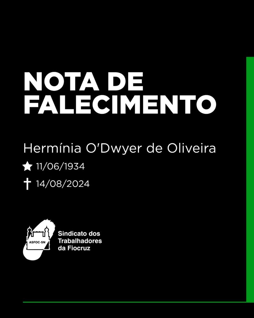 É com pesar que a Asfoc recebeu a notícia do falecimento de Hermínia O’Dwyer de Oliveira, esposa do ex-consultor jurídico do Fioprev, Dilton Barreto. Dona Hermínia nos deixou nesta quarta-feira (14/08), aos 90 anos. A pedido dela, a cerimônia de cremação será restrita aos familiares e, por esse motivo, as informações de data, horário e local do sepultamento não foram divulgadas.